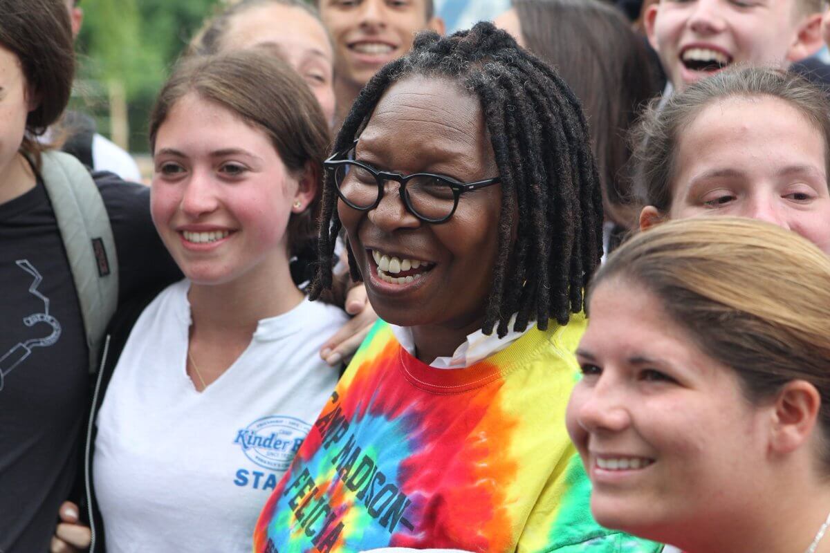 “Camp is great. For me, what camp gave me was the ability to look people in the eye and listen to them tell me who they were because I didn’t know a lot of folks different from me so to meet lots of different colored people was a great thing. It allowed us not to think of them as a black person or a Latino person. When you are at camp, you’re just people,” explained Whoopi to hundreds of young campers at Camp Kinder Ring. “When you get out of camp, other people will try to push you into thinking differently and chances are because of the people you’ve met here, you’ll pause and say I don’t know if I agree. At camp, you will become a person who thinks as an individual. Camp gives you the ability to make up your own mind about what you think. Don’t let anybody talk you out of that.”