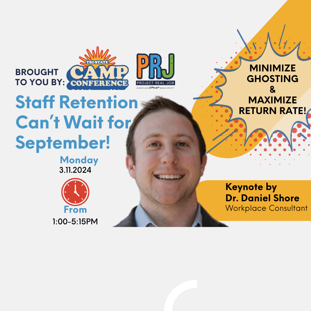 ACA’s Project Real Job team is hosting a Tri-State PreCon Workshop to dive into those very questions and strategize retention throughout the staff life cycle (leading up to camp, during the season, and post-summer). The opening keynote session with Dr. Daniel Shore, a Workplace Consultant with a PhD in Organizational Psychology, will begin at 1:00 pm EST and provide a framework for strategizing about staff retention at the various stages of the staff life cycle. Throughout the afternoon, there will be an opportunity to collaborate and exchange ongoing retention practices with session attendees. Time will also be dedicated to showcasing ACA Project Real Job resources that are available to help with staff recruiting, hiring, and retention efforts. You will leave with renewed energy and a more robust staff retention plan that starts NOW with sights set on 2025 and beyond!